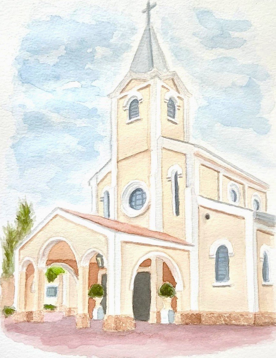 Arte em aquarela : Igreja São José do Jardim Europa (São Paulo-SP), pintada à mão pela talentosa Ana Luiza Martins, nossa amiga querida.
